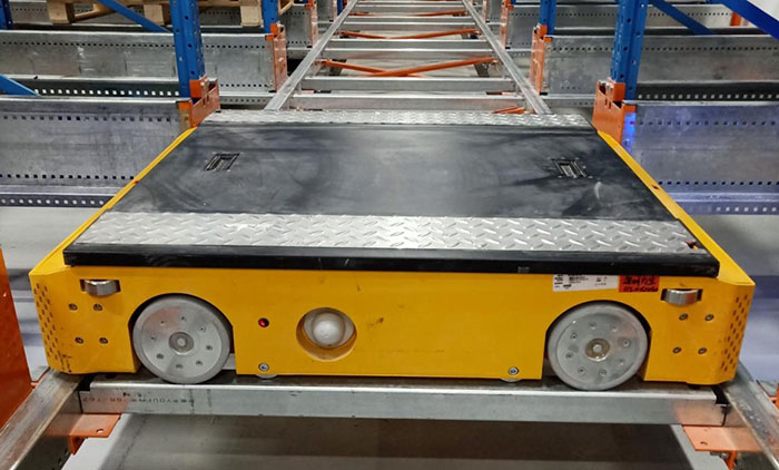 用于托盤類貨物搬運,它既能實現縱向行走亦能實現橫向行走,可以到達倉庫任意位置;貨物在貨架內的水平移動和存取作業只由一臺托盤式四向穿梭車完成,通過提升機換層,系統自動化程度大大提高,是托盤類密集存儲解決方案的最新一代的智能搬運設備。
