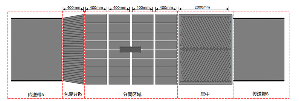 包裹分散:主要將黏連通過的包裹拉開少許間距,用于優(yōu)化單件分離的分離效果,且防止包裹擁堵時卡包;