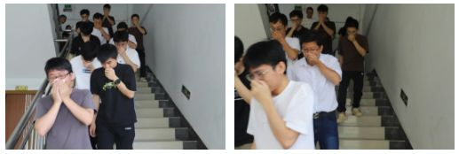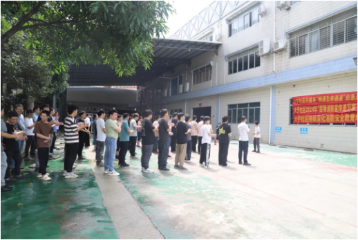 隨著急促的警鈴聲響起,全體員工迅速進入應急狀態。他們弓腰、捂鼻,模擬在煙霧中撤離,有條不紊地從辦公區、車間、宿舍的安全出口疏散,匯流到籃球場,勝利會師。